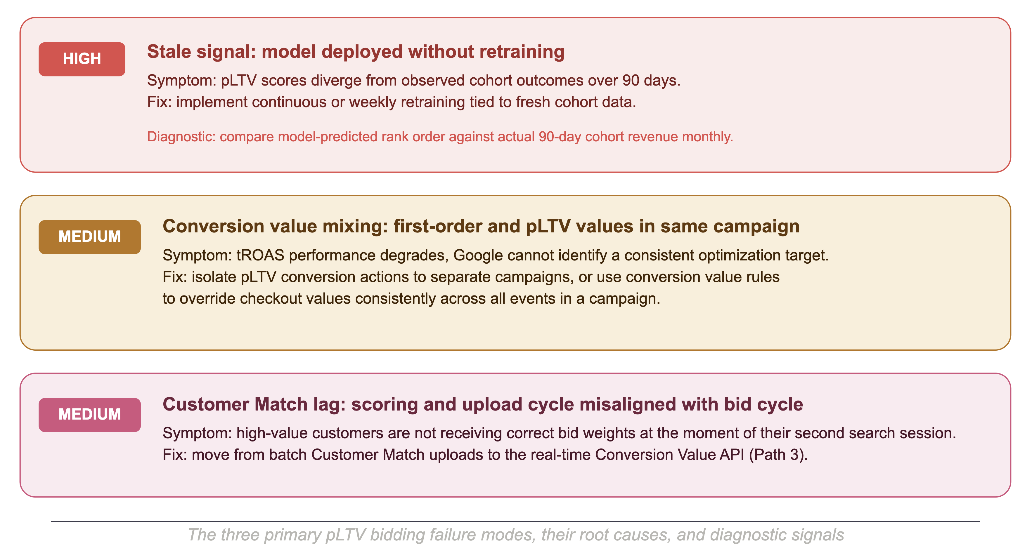 - The three primary failure modes are stale model signals, mixed conversion value types within a campaign, and Customer Match lag misaligned with bidding cycles.