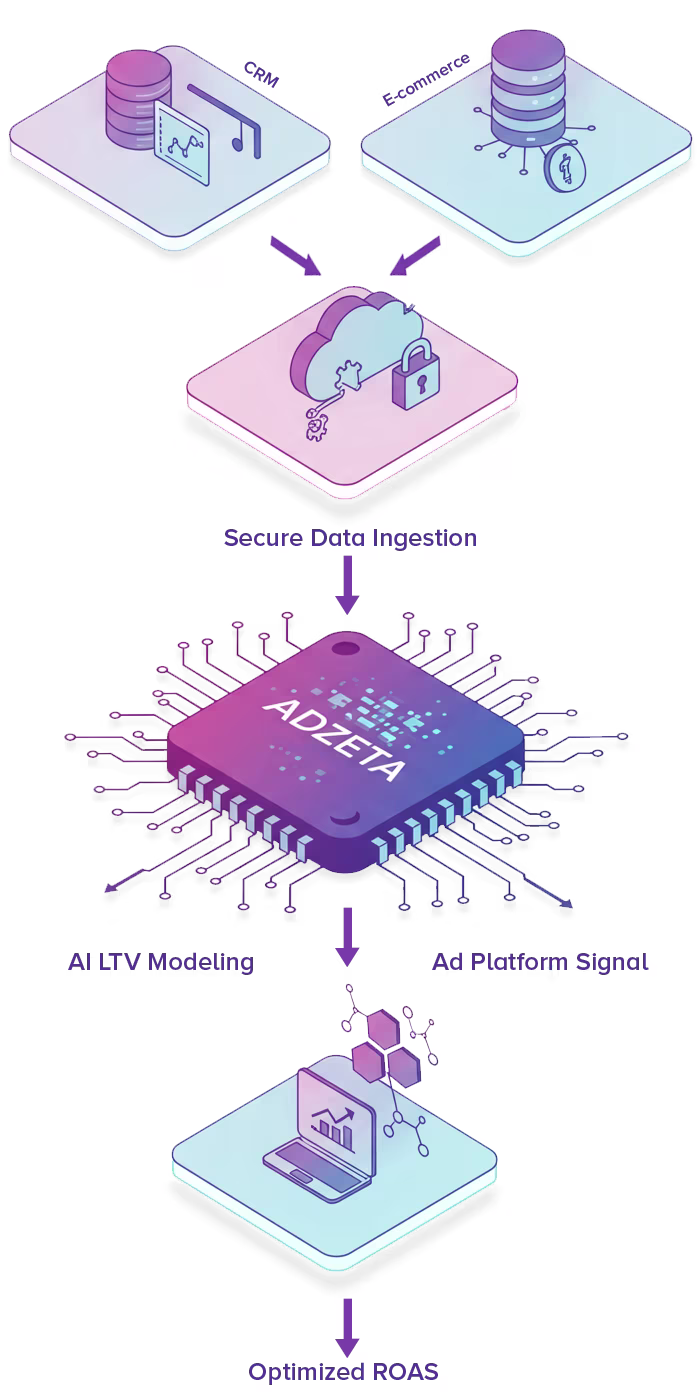 Stop guessing with your ad spend. AdZeta connects your e-commerce data to our AI, empowering ad platforms with the LTV intelligence they need to find your most profitable customers. Our onboarding is secure, swift, and fully supported by e-commerce advertising specialists.